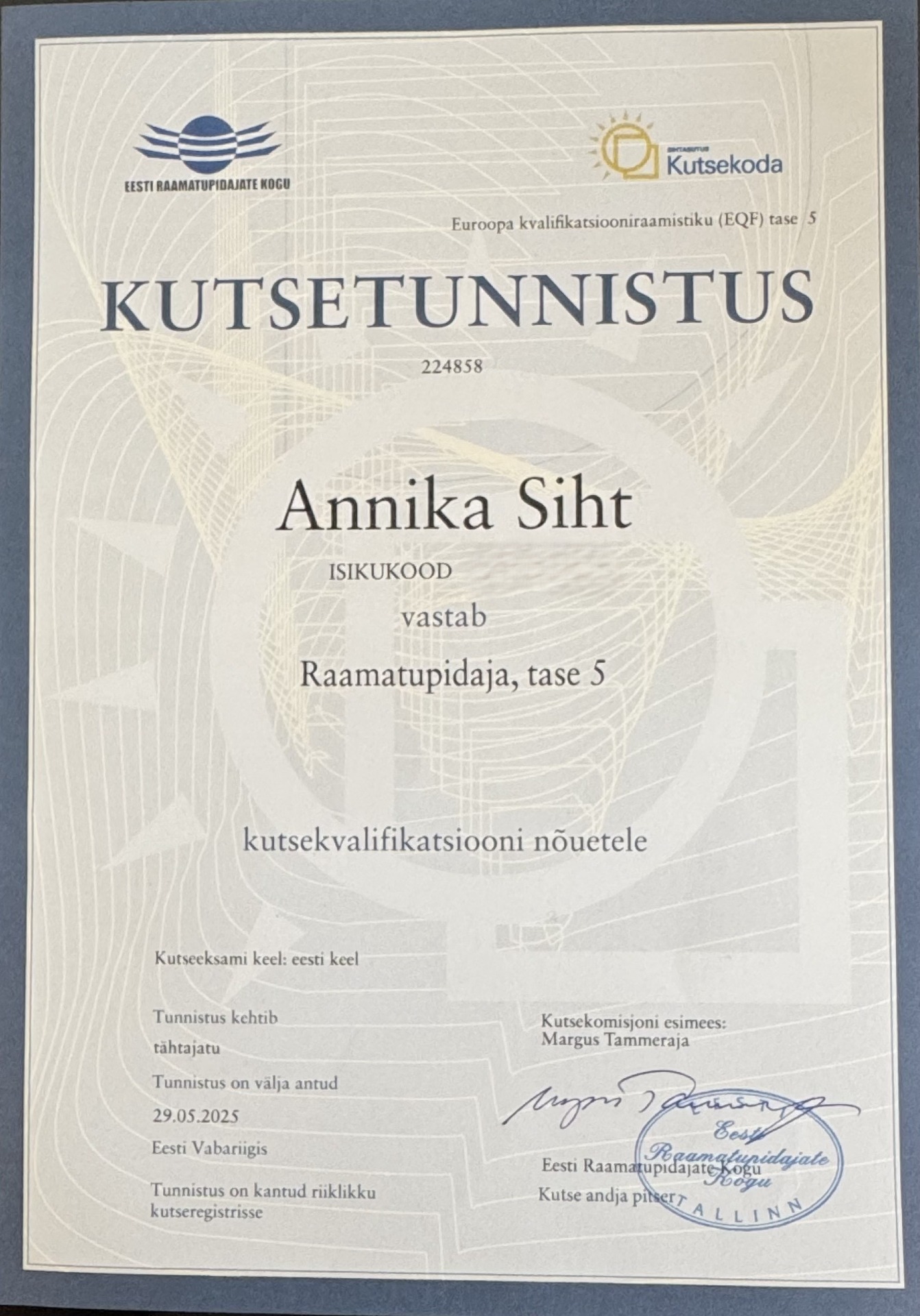 2025.aastal lõpetasin kooli kiitusega ning sooritasin tugeva 97,4% tulemusega raamatupidaja, tase 5 kutseeksami.